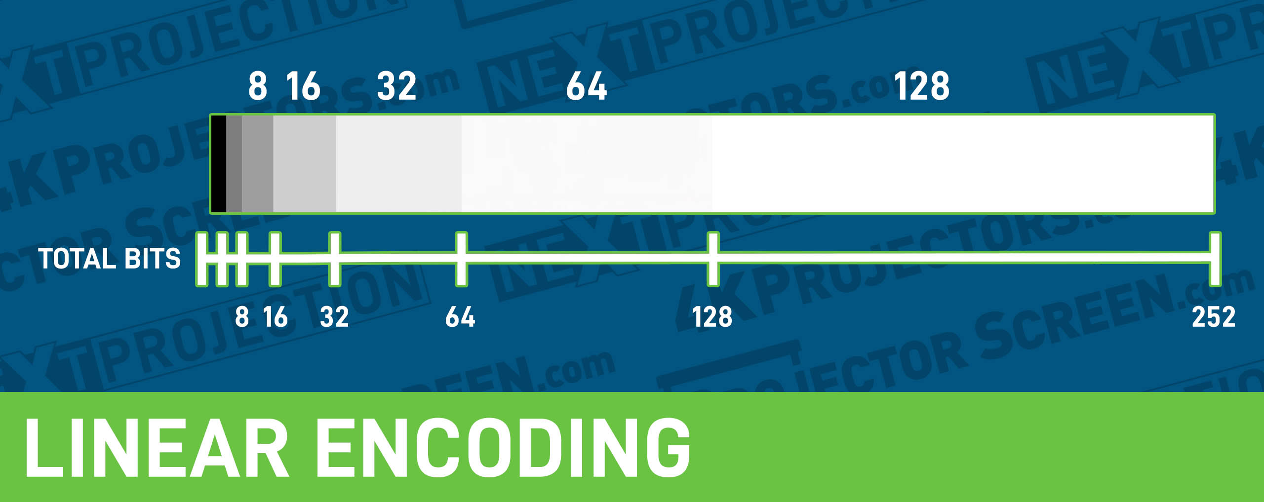 If we imagine an 8-bit image, let's say four bits is the darkest signal. The camera can register. So twice as bright as that to medium gray is eight bits, double that to 16, then 32, 64, 128. And that doubles to 252, which is essentially all the data we can record. And that's our white point.